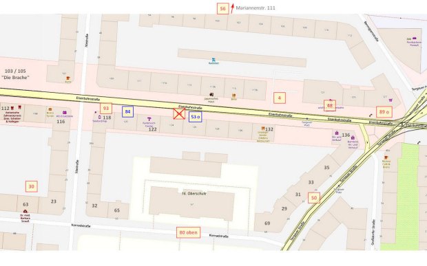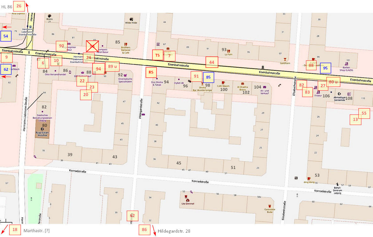 • 30 und 93 diese Hofszenarien konnten durch die Beschriftungen an den Mülltonnen zugeordnet werden: K63 – Konradstraße 63 und ETh 118 entspricht der Ernst-Thälmann-Straße 118