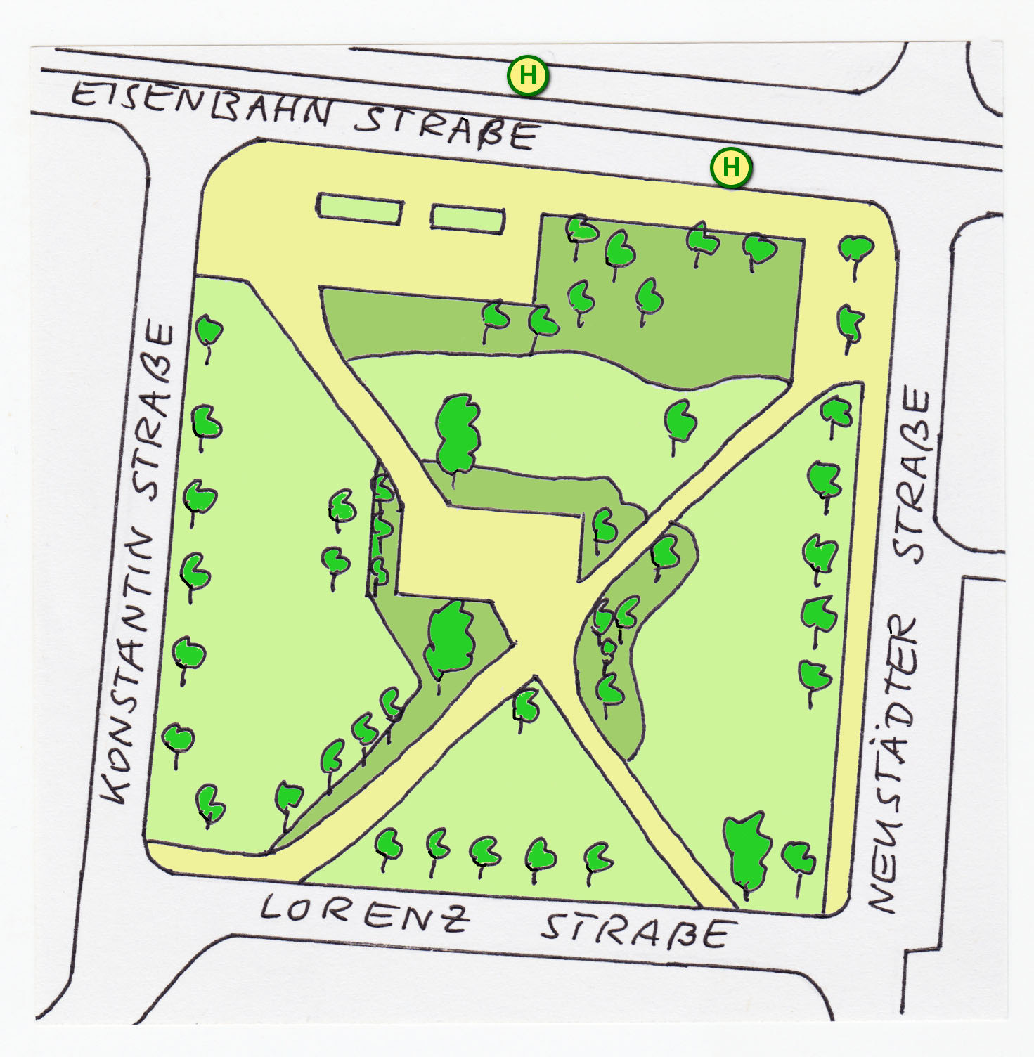 Hier am Schluss noch ein Blick von der Ecke Lorenz-/Konstantinstraße auf den heutigen grünen Runkipark mit den alten Baumbeständen.