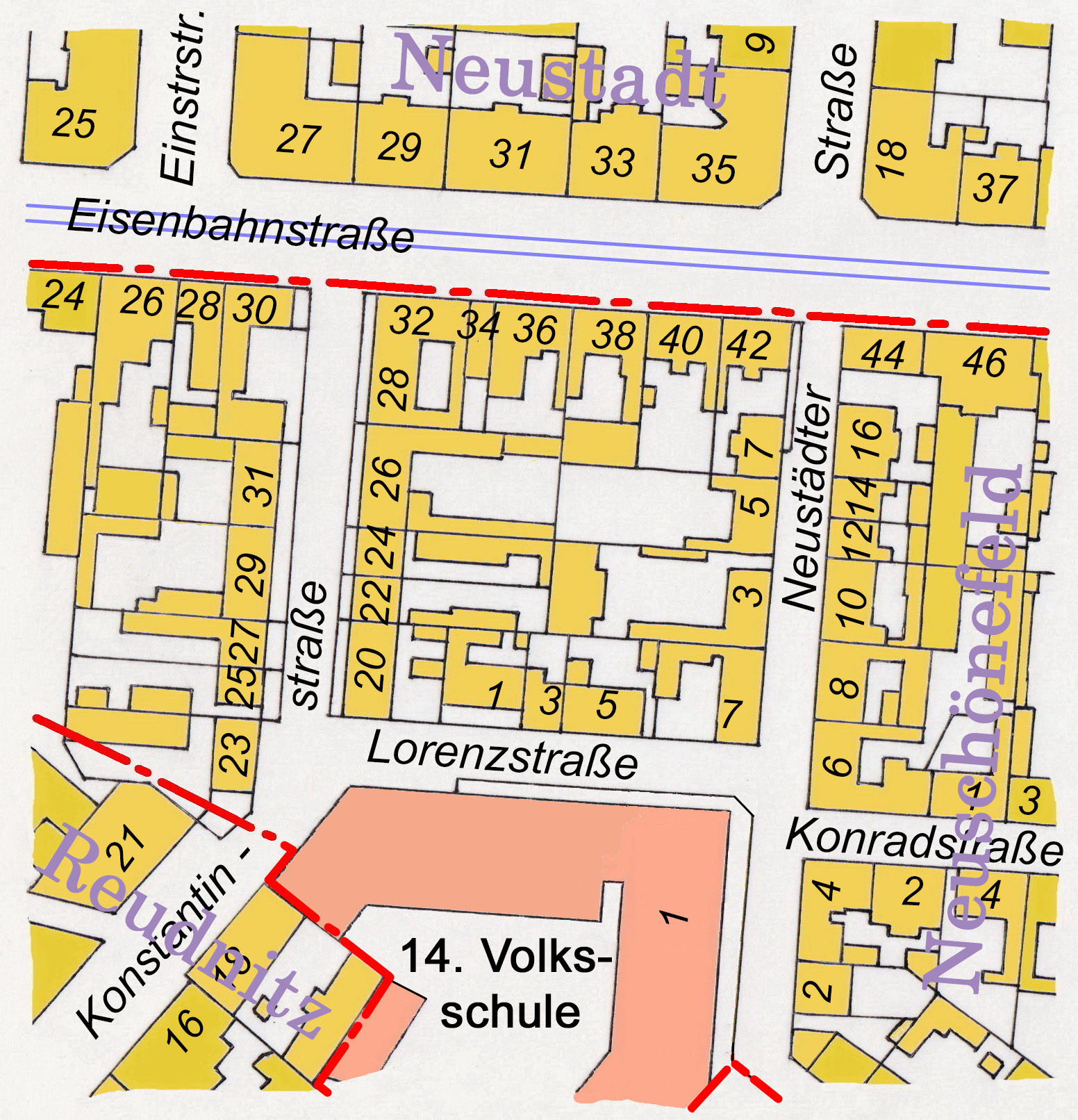 • Damit wurde auch in diesen beiden Straßen die neue Nummerierung eingeführt: aufsteigend auf der linken Seite die ungeraden sowie auf der rechten die geraden Hausnummern. Nach der Erweiterung des Neuschönefelder Schulgebäudes um den kompletten Anbau auf der Seite der Lorenzstraße (unter der Hausnummer Neustädter Str. 1) gab es in der Lorenzstraße nur noch die ungeraden Hausnummern 1 bis 7.