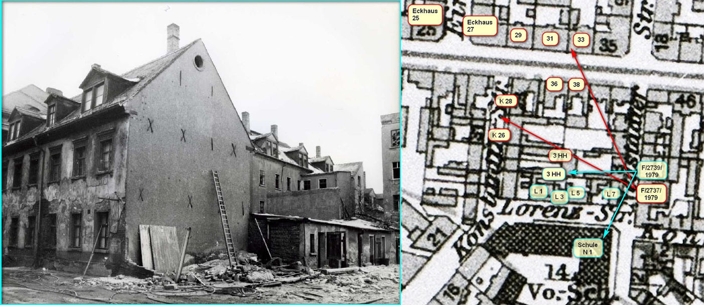 • Bild links (von links beginnend) Lorenzstraße 7, Hinterhaus Neustädter Str. 3, Konstantinstr. 26 und 28 (im Hintergrund Eckhaus Ernst-Thälmann-Str. 25), davor weiter mit Ernst-Thälmann-Str. 36 und 38,
