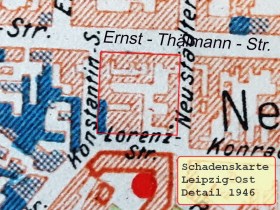 • Quelle #5:   Schadenskarten von Leipzig nach dem 2. Weltkrieg: LAB 1943, mit Eduard Gaebler: Grosser Plan von Leipzig, 1:15 000, Kupferstich, 1943, online: http://www.deutschefotothek.de/documents/obj/90043574 und Leipzig gestern heute morgen. Ein Atlas. Sozialistische Einheitspartei Deutschlands, Kreis Leipzig (Hrsg.), Leipzig 1946, Seite 16 mit Osten von Leipzig, siehe auch online: https://geheimtipp-leipzig.de/der-leipzig-atlas-von-1946/
