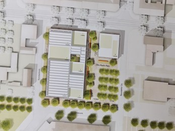 Links ein Blick auf Modell des Siegerentwurf (gmp) vom Dach der Neustädter Straße 18 mit Blick nach Südwesten zur Konstantinstraße: rechts die Schwimmhalle und links der Würfel ist ein MVZ, ein medizinisches Versorgungszentrum – vielleicht so eine Art Ärztehaus, wer weiß?