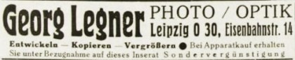 Georg Legner inserierte auch Ende der 1920er Jahre im Heft ,,Der Arbeiterfotograf“, das in einem Berliner Verlag erschien.