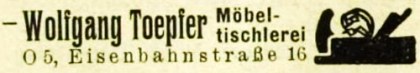 1938 bis 1941 kann man im Adreßbuch in der Eisenbahnstraße 18 nur noch den Eintrag lesen: Toepfer, Wolfgang, Holzwfbrk. [Holzwarenfarbrikant] und in den Jahren 1942 und 43: Toepfer, Wolfgang, Möbeltischlerei. Im Dezember 1943 werden die Gebäude in der Eisenbahnstraße 16 und 18 wie bereits erwähnt zerstört. [Quellen #4 und #5]