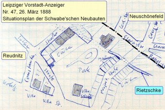 ,,Durch Vereinigung der vormals Dr. Gaudlitz’schen, Constantin Schultze’schen und Remmler’schen Grundstücke und der Mägdeherberge in Reudnitz, welche vom Marienplatze aus durch das Ranft’sche Pförtchen in wenigen Minuten zu erreichen ist, hat der Besitzer derselben, Dr. Wilmar Schwabe, einen Baukomplex geschaffen, bei dessen Bebauung darauf Bedacht genommen werden wird, im Osten Leipzigs, also in gesundester Lage, billige und gut eingerichtete Familienwohnungen zu schaffen, welche die Vortheile der Landwohnungen mit denen der Stadt in sich vereinigen werden.“ - Und zum Zweiten sind die zu diesem Zeitpunkt im März 1888 bereits bestehenden Gebäude in der Constantinstraße auf einer Karte dunkel gekennzeichnet, siehe Skizze unten links.