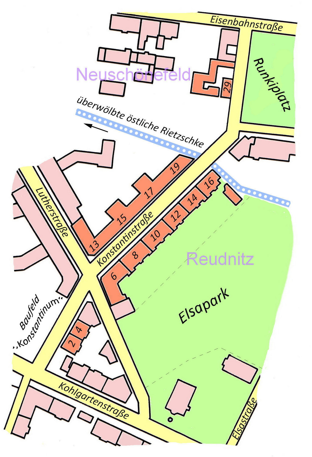 Die Konstantinstraße ist eine relativ kurze Straße im Leipziger Osten; sie beginnt an der Kohlgartenstraße, kreuzt die Lutherstraße, hat einen Abzweig an der Lorenzstraße (am Runkiplatz) und endet an der Eisenbahnstraße. In nebenstehender Skizze habe ich versucht die dazu gehörigen Häuser mit Hausnummern und oranger Farbe kenntlich zu machen. Es gibt momentan 12 Hausnummern in der Konstantinstraße. Drei kommen vielleicht in der nächsten Zeit noch hinzu, wenn das Baufeld des ,,Konstantinum“ an der Ecke Kohlgarten-/Konstantinstraße fertig wird.