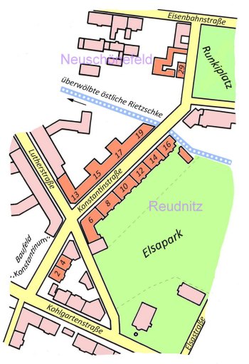 - Hier wird zum Ersten ein Gutsbesitzer mit dem Namen Constantin Schulze erwähnt, der im fraglichen Gebiet zwischen Konstantin-, Kohlgarten-, Elsastraße und der Rietzschke offensichtlich Grundstückseigentümer gewesen war: