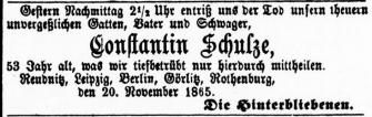 - Quelle #5: Leipziger Tageblatt und Anzeiger, vom Dienstag, den 21. November 1865, Seite 15, Todesanzeige Constantin Schulze, online unter: https://digital.slub-dresden.de/werkansicht/dlf/224695/