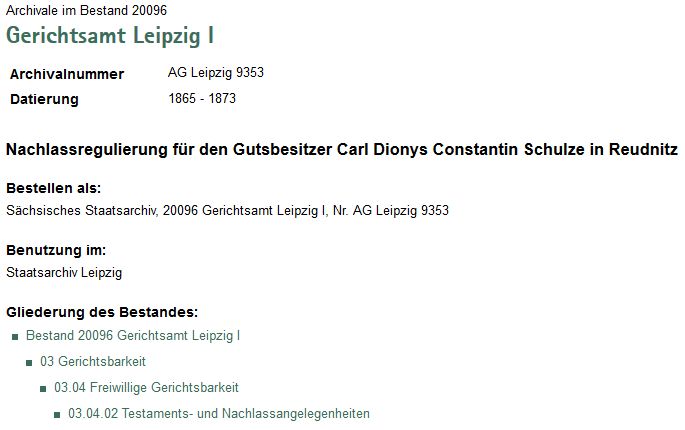 - Quelle #4: Staatsarchiv Sachsen, Nr. AG Leipzig 9353 (Gerichtsamt Leipzig): Nachlassregulierung für den Gutsbesitzer Carl Dionys Constantin Schulze in Reudnitz, 1865 bis1873
