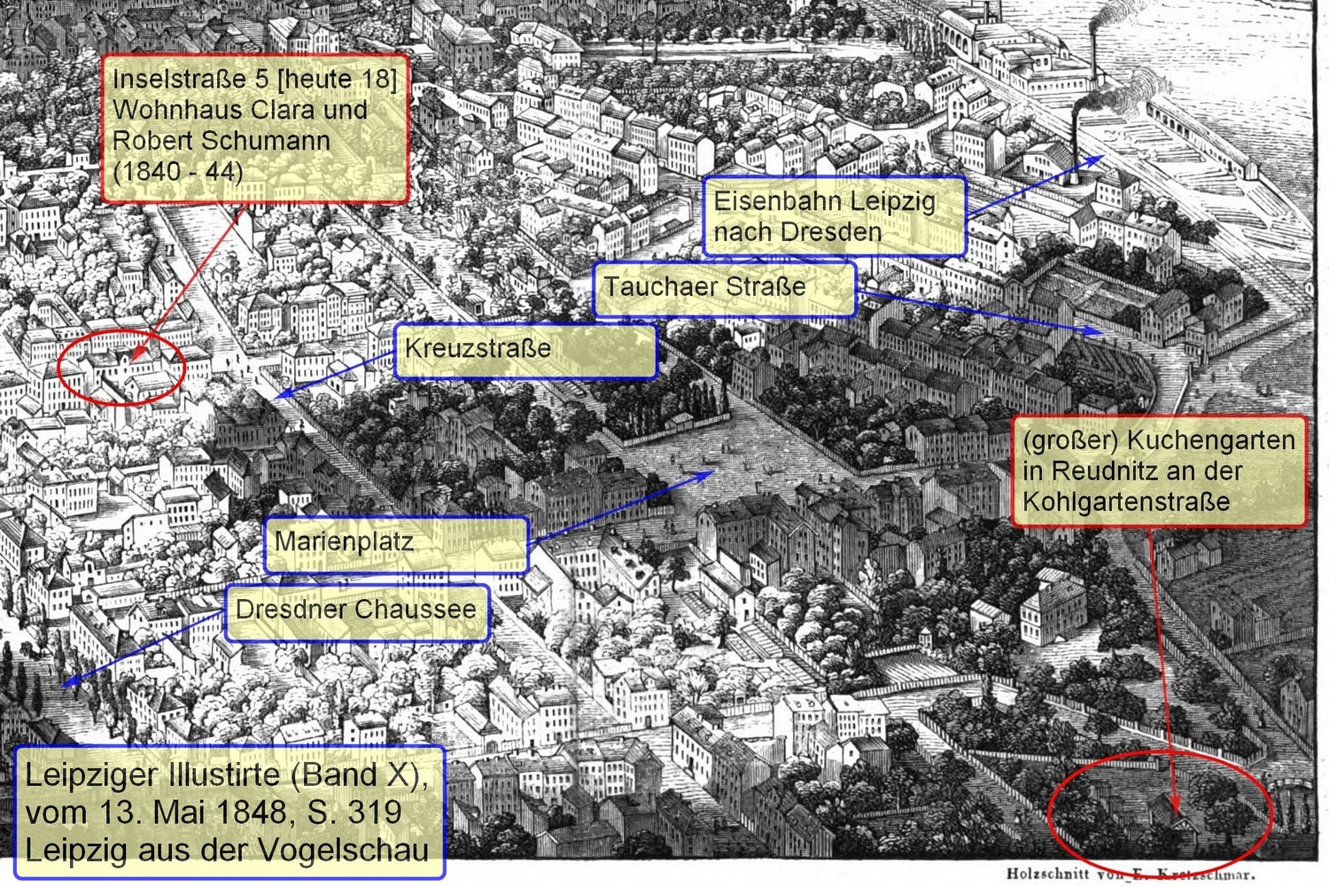 Nach der Hochzeit im September 1840 zogen Clara und Robert Schumann in die Inselstraße 5. Zur Illustration der Wohnlage habe ich in einem Bildausschnitt der Leipziger Illustrirten (13. Mai 1848) die Wohnlage der Schumanns in der Inselstraße, verschiedene Straßen im Leipziger Osten und den Kuchengarten an der Kohlgartenstraße markiert. Wie man sehen kann, lag die Restauration Kuchengarten nicht weit von der Wohnung entfernt. Da hatten es die Schumanns, wenn sie mal in Leipzig waren, eigentlich einen kurzen Weg.