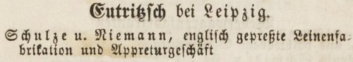 • Quelle #1:   Das industrielle Sachsen, Adreßbuch der sämmtlichen Fabrikanten im Königreiche Sachsen, Moritz Böhme in Chemnitz, Ostermesse 1852, Seite 29 Eutritzsch bei Leipzig Schulze u. Niemann, englisch gepreßte Leinenfabrikation und Appreturgeschäft