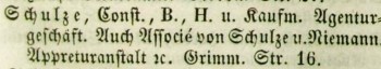 In der Leipziger Grimmaischen Straße 16 (später Nr. 32), mit der Gebäudebezeichnung ,,Mauricianum„, befand sich in den 1850er Jahren das Agenturgeschäft des Reudnitzer Kaufmanns Constantin Schulze. Das kann man einer Eintragung im Leipziger Adreß-Buch (LAB) auf das Jahr 1852 entnehmen. Und Schulze war außerdem Associé [Teilhaber] von Schulze u. Niemann, siehe Ausschnitt links. [Quelle #6]