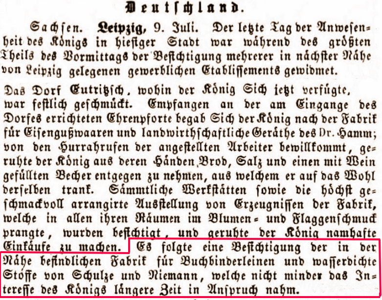 Ein wichtiger Tag für Schulze & Niemann war der Besuch des sächsischen Königs Johann während der ,,Königstage von Leipzig“ am 9. Juli 1862 auf dem Eutritzscher Firmengelände, der ,,das Interesse des Königs längere Zeit in Anspruch nahm.“  Bei diesem Besuch ging es den Firmeninhabern nicht so sehr um die Person des Königs oder der Staatsrepräsentation, sondern vor allem um das Bekanntmachen und die Anerkennung als aufstrebende Firma in den bürgerlichen Kreisen. [siehe Zeitungsausschnitt unten links: Quelle #2 11.]