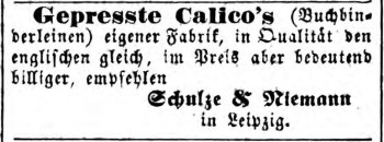 Dazu zählten auch der Reudnitzer Kaufmann Constantin Schulze und sein technischer Geschäftspartner August Niemann aus Reudnitz, die sich zu diesem Zweck zusammen schlossen.  In einer der ersten Anzeigen der neuen Firma Schulze & Niemann wird in der Leipziger Zeitung vom 7. November 1850 für preiswerte ,,Calico’s“ (Buchbinderleinen) aus Leipzig geworben, siehe Anzeige links. Auch andere historische Quellen zur sächsischen Industriegeschichte weisen darauf hin, dass die Firma Schulze & Niemann um Jahr 1850 herum gegründet wurde. [Quellen #2 1. Anstrich / #3, #4, #5]