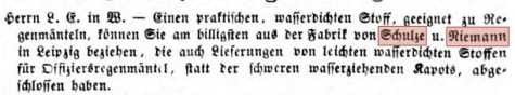 Und drittens am Rande: noch ein kurioser Zeitungsartikel aus der Illustrirten Zeitung vom 21. Mai 1859, S. 288 zu besonderen Verwendungszwecken wasserdichter Stoffe aus der Fabrik von Schulze & Niemann.