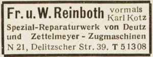 Und eine letzte Anmerkung: Auf dem Firmengelände an der Delitzscher Straße gab es auch mehrere kleine Firmen. Ein paar davon haben den Niedergang von Schulze & Niemann überdauert, z.B. die Firma der Gebrüder Reinboth, seit dem Jahr 1906 in der Delitzscher Str. 39 nachweisbar.