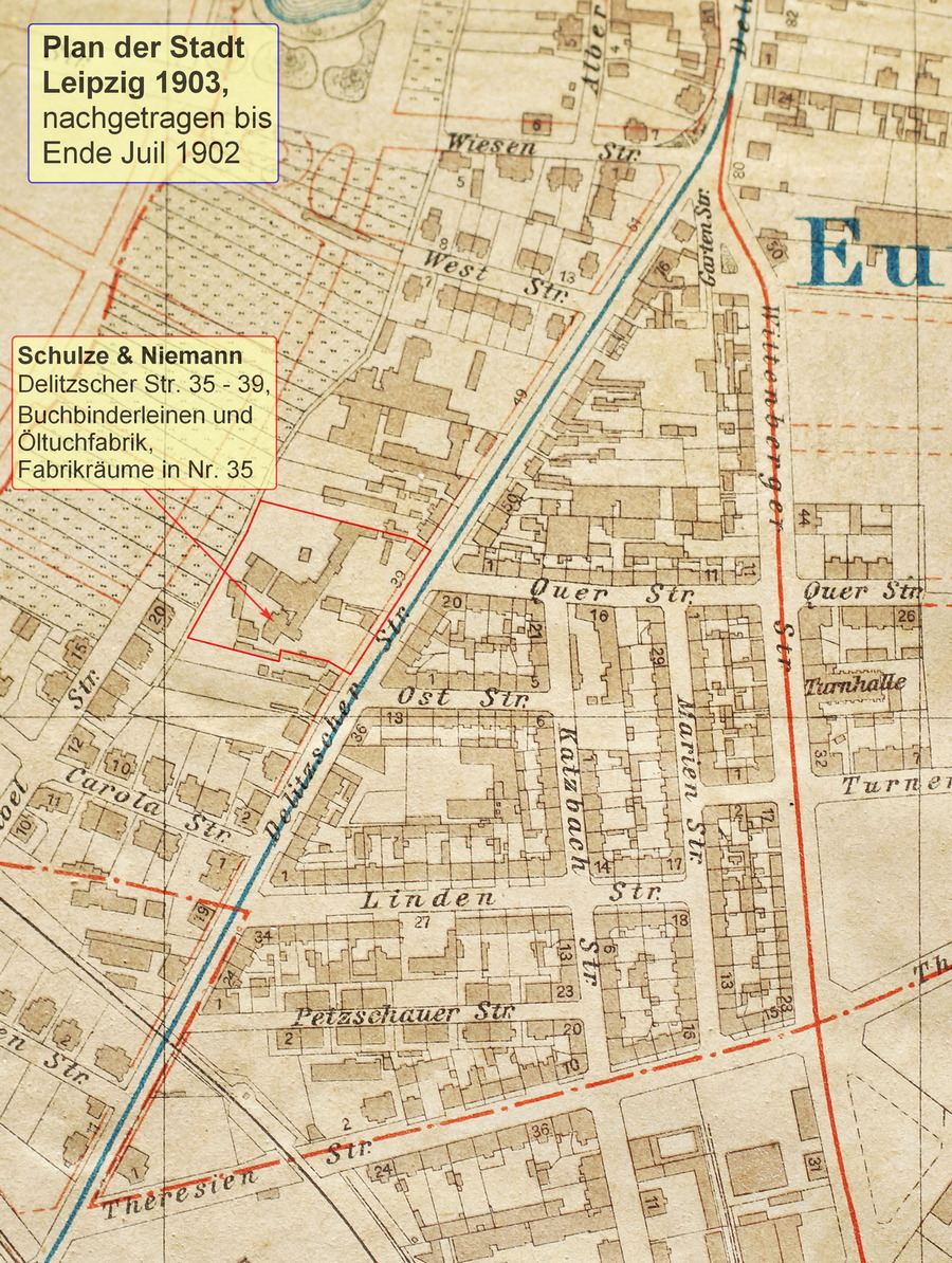 Im Jahr 1891 wird die Leipziger Straße in Eutritzsch (von Leipziger) in Delitzscher Straße umbenannt. Die Fabrikgebäude von Schulze & Niemann tragen ab dieser Zeit die neuen Straßenbezeichnungen Delitzscher Straße 35 bis 39.