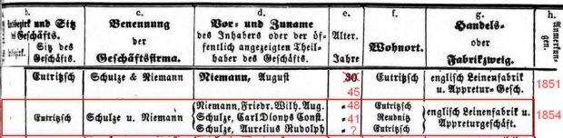 Während in einer Fabrikanten-Aufstellungen aus der Leipziger Zeitung  des Jahres 1851 als Inhaber der ,,englischen Leinenfabrik“ von Schulze & Niemann nur der Eutritzscher August Niemann angegeben wurde, sind in der Aufstellung vom Jahr 1954 auch die Namen der Schulze’schen Inhaber/Teilhaber mit angegeben: