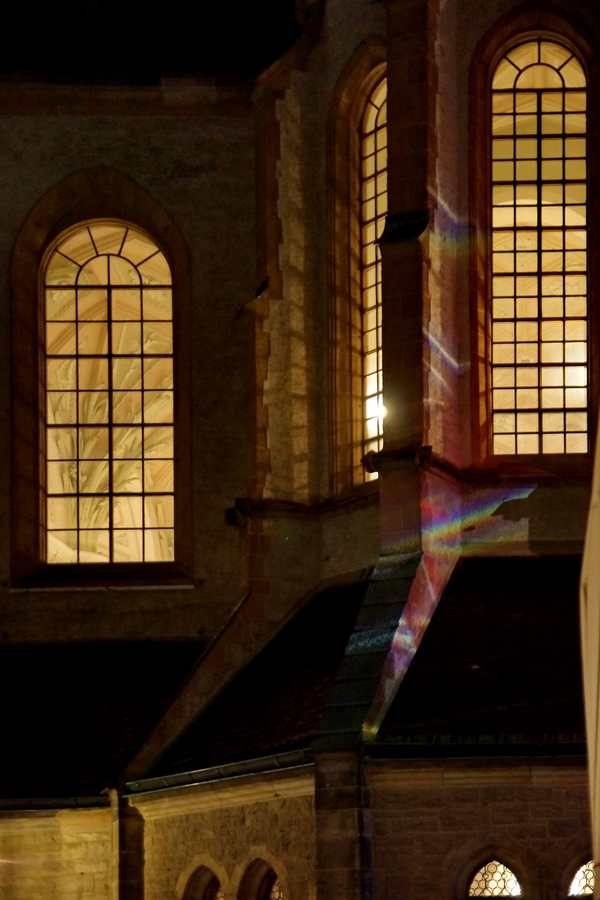 Die Nikolaikirche in rot getaucht mit weißem Strahlennetz auf dem linken Bild – sollen da ,,Rote“ eingefangen werden? Da finde ich das Bild auf der rechten Seite interessanter. Durch die Kirchenfenster hindurch kann man die Palmenblätter am Altarraum sehen, ein richtiger schöner ,,Licht-Blick“ – meine ich.
