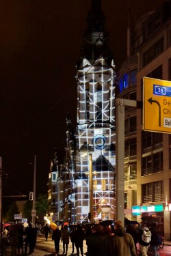 Zitat: Am 9. Oktober 2019 gestaltet Künstlerin Victoria Coeln die historische Demonstrationsstrecke mit Licht. Dafür verwendet sie eine ausdrucksstarke, vielfältige Bildsprache. Bild- und Videomaterial überlagern Fassaden und Räume vielschichtig. An ausgewählten Standorten ergänzen Klangcollagen den visuellen Ansatz. Mit ihrer Installation verbindet die Künstlerin ein ganz besonderes Anliegen: ,,Ich würde mir wünschen, dass das Licht am 9. Oktober nur Mittel zum Zweck und das Leuchten in den Augen der Teilnehmenden zum eigentlichen Lichtfest wird. Die Sprache des Lichts beinhaltet die großartige Möglichkeit, dem Bedrohlichen, den Schatten und Unschärfen mit dem Hellen, Warmen, Hoffnungsvollen zu begegnen.“