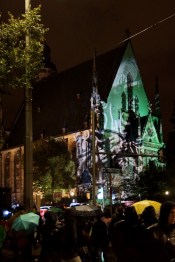 Foto 5 Blick nach Westen zur Reformierten Kirche (Bild unten, auf der linken Seite). Die Reformierte Kirche ist in einem weißen Lichtnetz gefangen. Davor ist ein Schild mit einer ,,15″ zusehen. Das könnte auf eine Installation Nr. 15 hinweisen. Allerdings fragten wir uns, wo die vielen Installationen von 1 bis 14 gewesen sein sollten – da war nicht immer was zu sehen gewesen …?