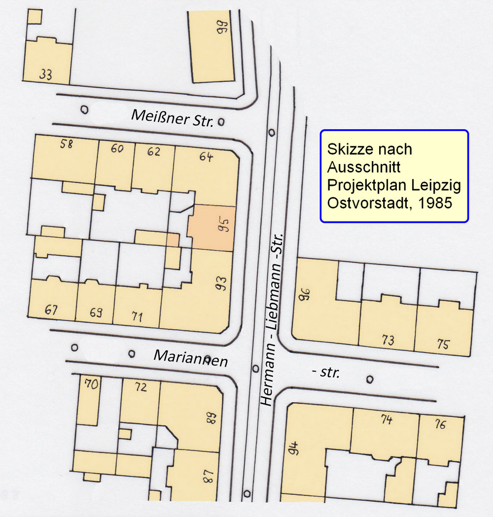 Mit der HL 95 ist das fünfgeschossige Gebäude in der Hermann-Liebmann-Straße Nr. 95 im Leipziger Osten gemeint, siehe Straßenskizze unten links.