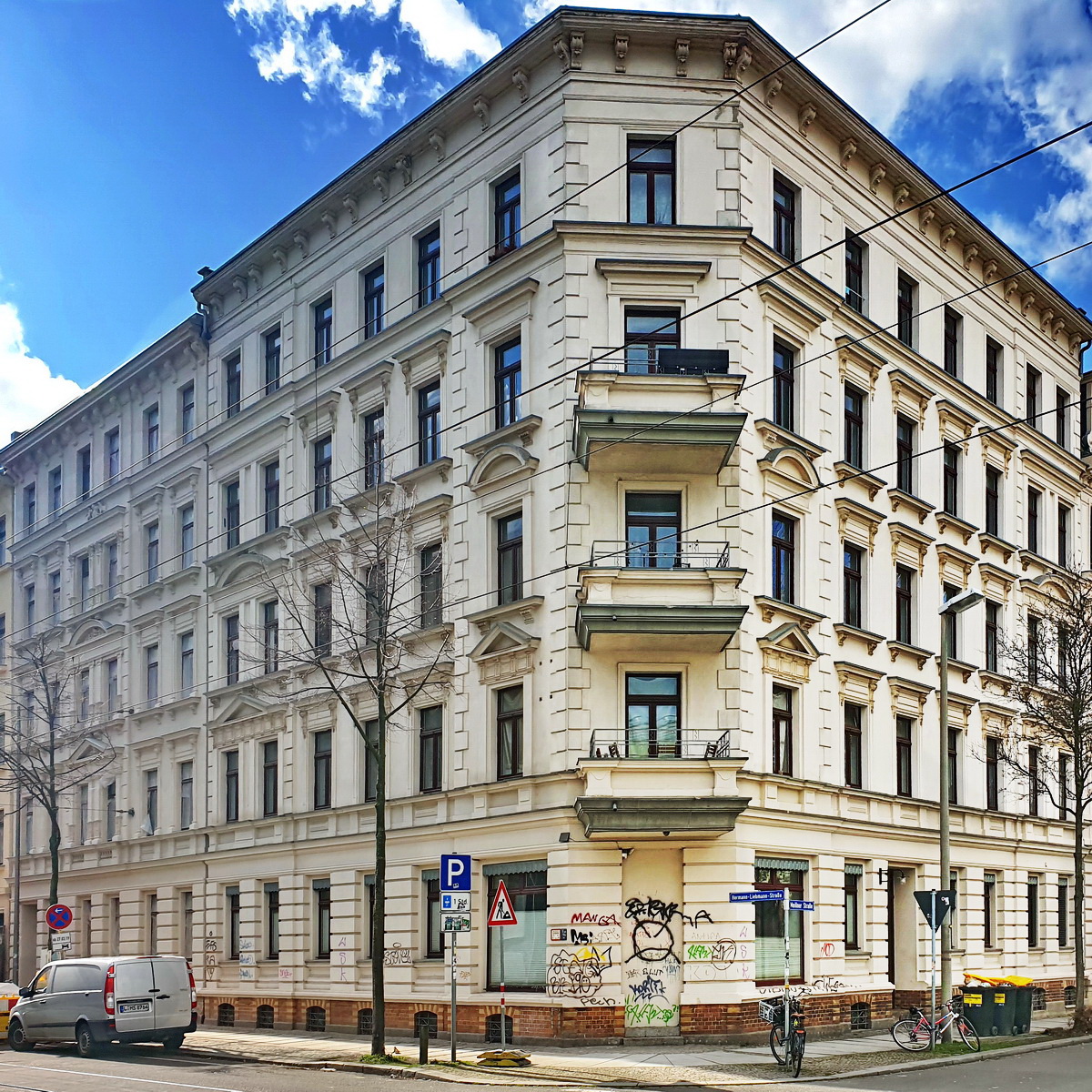 - Meißner Straße 64 [früher Marktstr. 18]: ebenfalls ein fünfgeschossiges Mietshaus in geschlossener Bebauung, etwas später auch im Jahr 1893 übergeben; mit Laden an der Ecke Meißner / Hermann-Liebmann-Straße, Putzfassade, Objekt-ID des Kulturdenkmals: Nr. 09293534