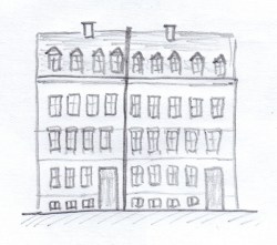 In der Bauakte Nr. 1866 ist auf Blatt 23 ein Situationsplan für die ,,neu zuerbauenden Wohnhäuser der Herren T(raugott). Illgner und A(ugust). Höhne an der Louisenstraße“ in Volkmarsdorf dargestellt. Daraus ist ersichtlich, dass diese Gebäude mit drei Stockwerken und Dachlogis in den Jahren 1863/64 gemeinsam errichtet wurden. Wie sahen die Häuser damals aus? Aus dem Gedächtnis habe ich mal grob versucht die Straßenfront zu zeichnen, Skizze links. Beide Häuser waren relativ schmal gebaut: das Haus Nr. 3 mit einer Breite von knapp 8 m und das Haus Nr. 5 mit knapp 10 m – beide etwa 10 m tief.