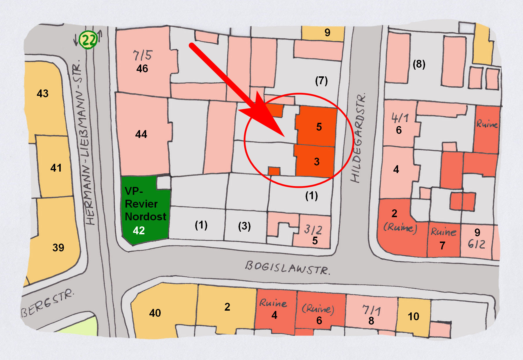 Links eine Volkmarsdorfer ,,Tatort-Skizze“ mit den beiden Häusern Hildegardstr. 3 und 5 (Pfeil) im Leipziger Osten. Die Skizze habe ich mithilfe einer Schadenskarte vom Dezember 1985 [unter Verwendung Quelle #2], unter Hinzufügung der Grundstücke Hildegardstr. 3 und 5 zusammengestellt, umgeben von Ruinen und ruinösen Gebäuden (orange eingefärbt), und vielen stark beschädigten Häusern (rosa eingefärbt). Zusätzlich habe ich das Gebäude mit den Hütern von Gesetz und Ordung vor Ort gekennzeichnet: das nahegelegene VP[Volkspolizei]-Revier Leipzig-Nordost (grün).