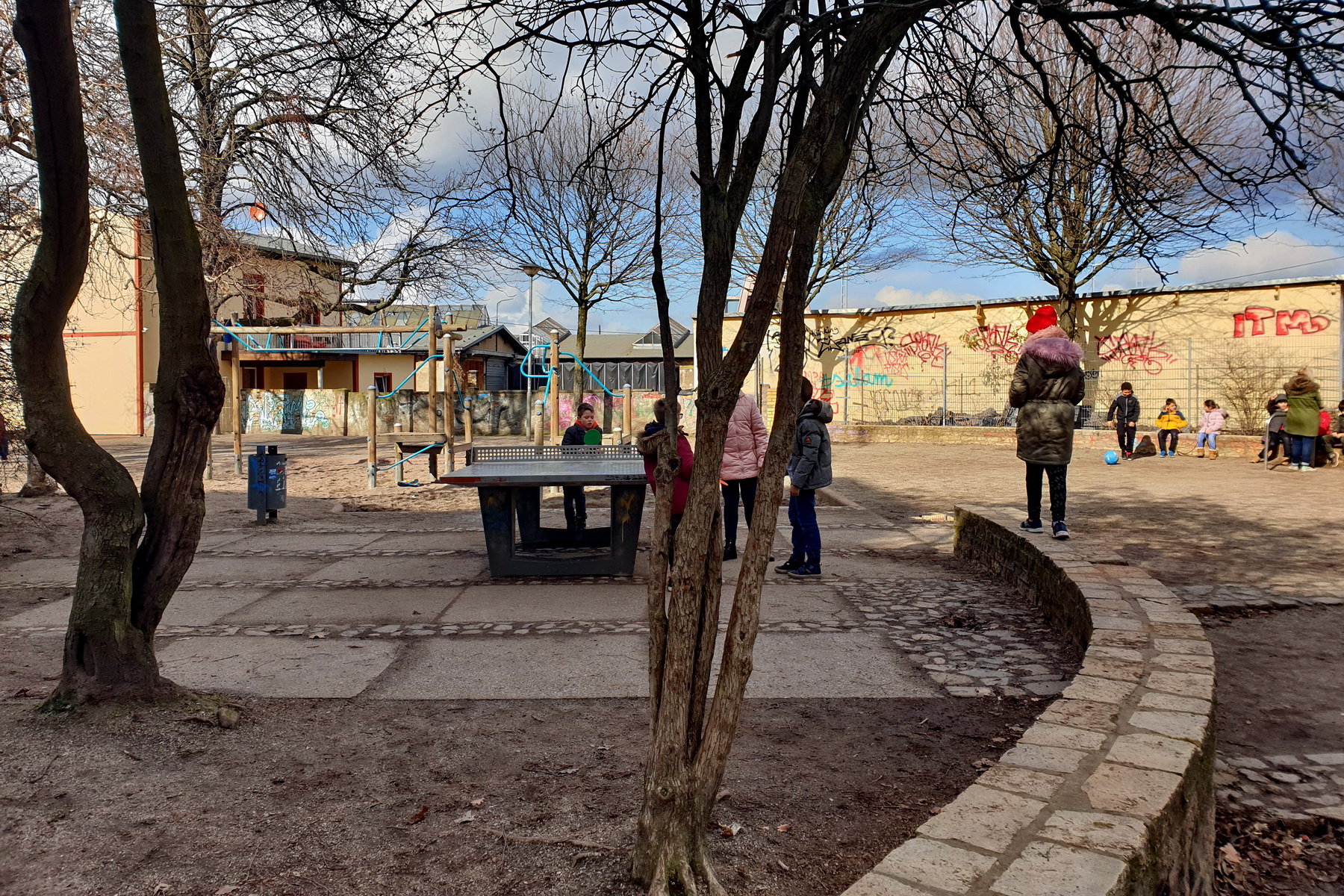 Auf dem rechten Bild ist die aktuelle Gestaltung dieses Geländes hinter der Schulze-Delitzsch-Straße bis zum Bahnareal zu erkennen: als Spielplatz mit Wippe, Kletterturm, Rutsche, Kletterwand, Matschtisch, Tischtennisplatte, Kletterpodest, Fußballplatz, Schattenplätzen und Bänken.