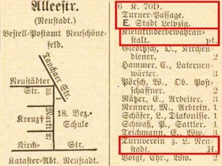 Im früheren Gemeindegebiet von Leipzig-Neustadt hat es eine ,,Turner-Passage“ gegeben. Das steht jedenfalls im Adressbuch des Jahres 1906 so drin, Ausschnitt rechts.