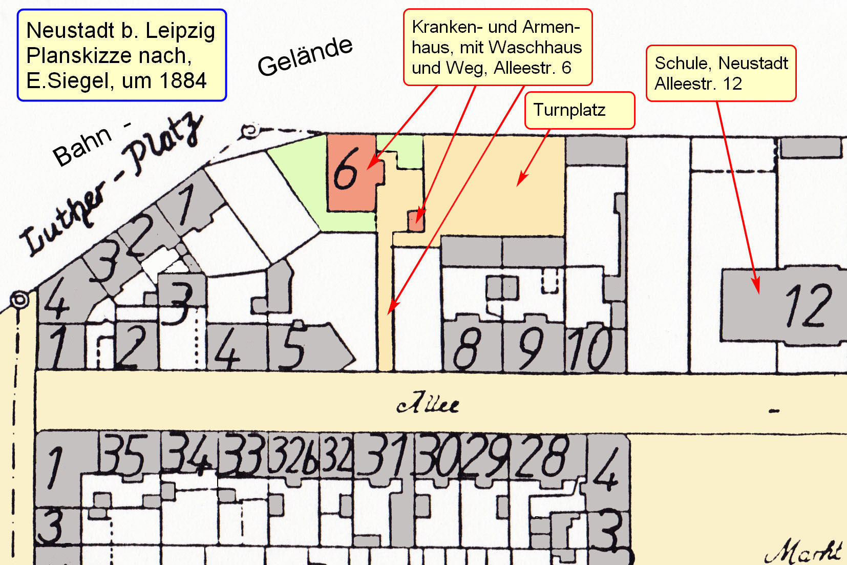 Im Jahr 1881 wurde die Gemeinde als Neustadt bei Leipzig eigenständig und damit unabhängig von Schönefeld und der Rittergutsherrschaft der Baronesse Hedwig von Eberstein. Damit konnten endlich wichtige Bau- und Regulierungsprojekte in Angriff genommen werden, die vorher aus Kostengründen versäumt oder verschleppt worden waren. Dazu zählte auch der längst überfällige Bau eines Armen- und Krankenhauses. Aus den Gemeindeakten von Neustadt [Quellen #5 und #6] heißt es in einem Schreiben an die Königliche Amtshauptmannschaft zu Leipzig: