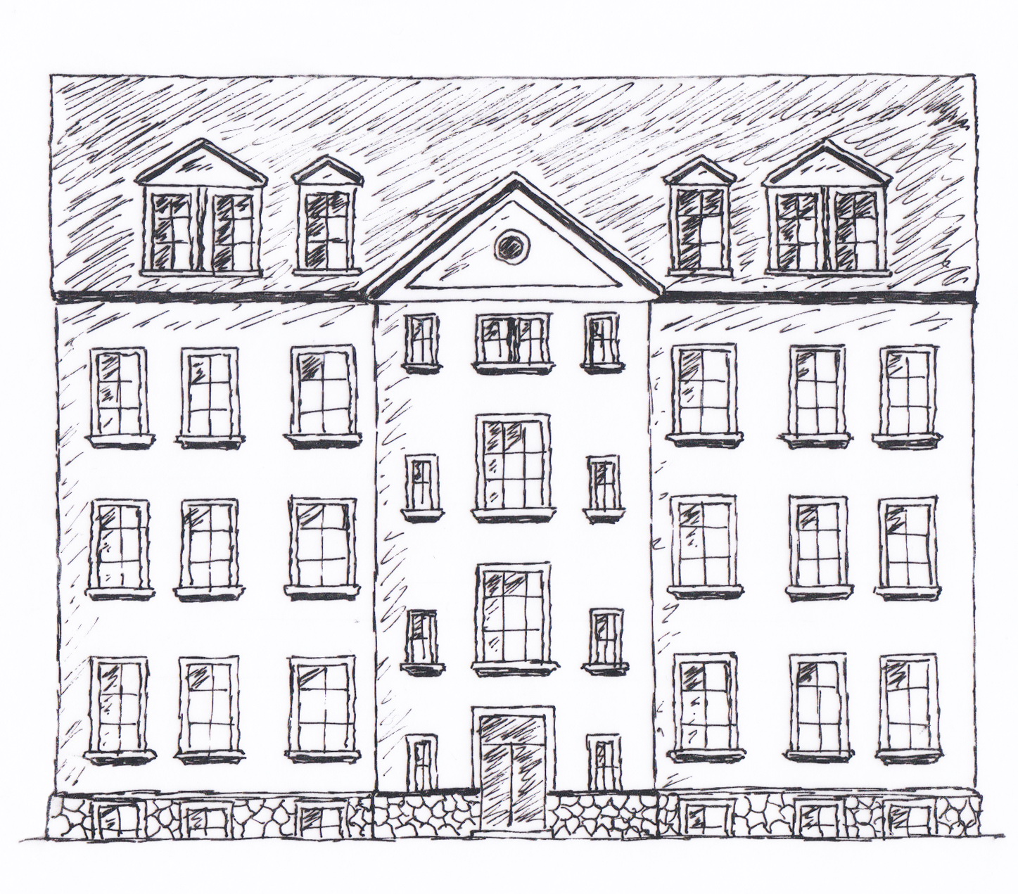 Von der Turnhalle konnte ich mangels fotografischer Abbildungen auch nur eine Skizze nach Vorlagen aus alten Bauakten mit von mir frei erdachter Fenstergestaltung anfertigen.