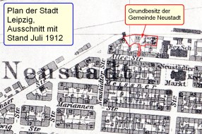Der Kartenausschnitt auf der rechten Seite stammt aus dem Jahr 1912 und zeigt den an der damaligen Alleestraße Nr. 6 bzw. 13 befindlichen Grundbesitz der Gemeinde Neustadt. Dieses Areal habe ich Rot gekennzeichnet. Die kleine Fläche auf der linken Seite dieses Areals gehörte bis Mitte der 1930er Jahre noch der Deutschen Reichsbahn. Sie nutzte diesen Bereich als Gartenfläche.