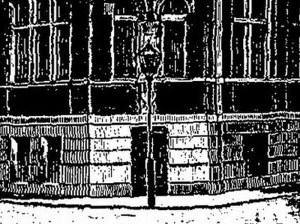 – im Sockelgeschoss befanden sich neben den Heizungskellern auch ein Wasch- und ein Wirthskeller und natürlich das Wachlocal mit einer Arrestzelle. Die Lage vom Eingang zum früheren Wachlokal (Skizze links) konnte man im September 2012 (Fotoausschnitt unten rechts) gerade noch erahnen.