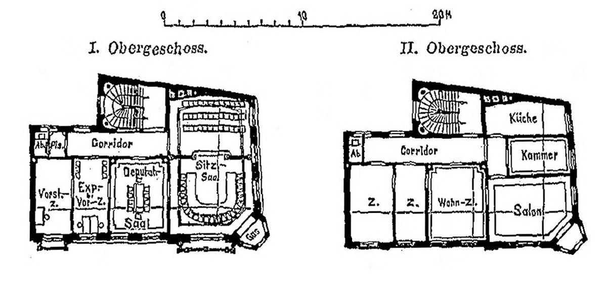 ,,Die klare Grundrissordnung, bei welcher, trotz des beschränkten Bauplatzes und der geringen Größe des Hofes, doch alle Räume ausreichend mit Luft und Licht versorgt werden, ist aus den Abbildungen genügend ersichtlich. Zur Erläuterung sei lediglich bemerkt, dass der kleinere zu Ausschuss-Sitzungen bestimmte Saal im Hauptgeschoss zugleich für die Zwecke des Standesamtes benutzt wird.