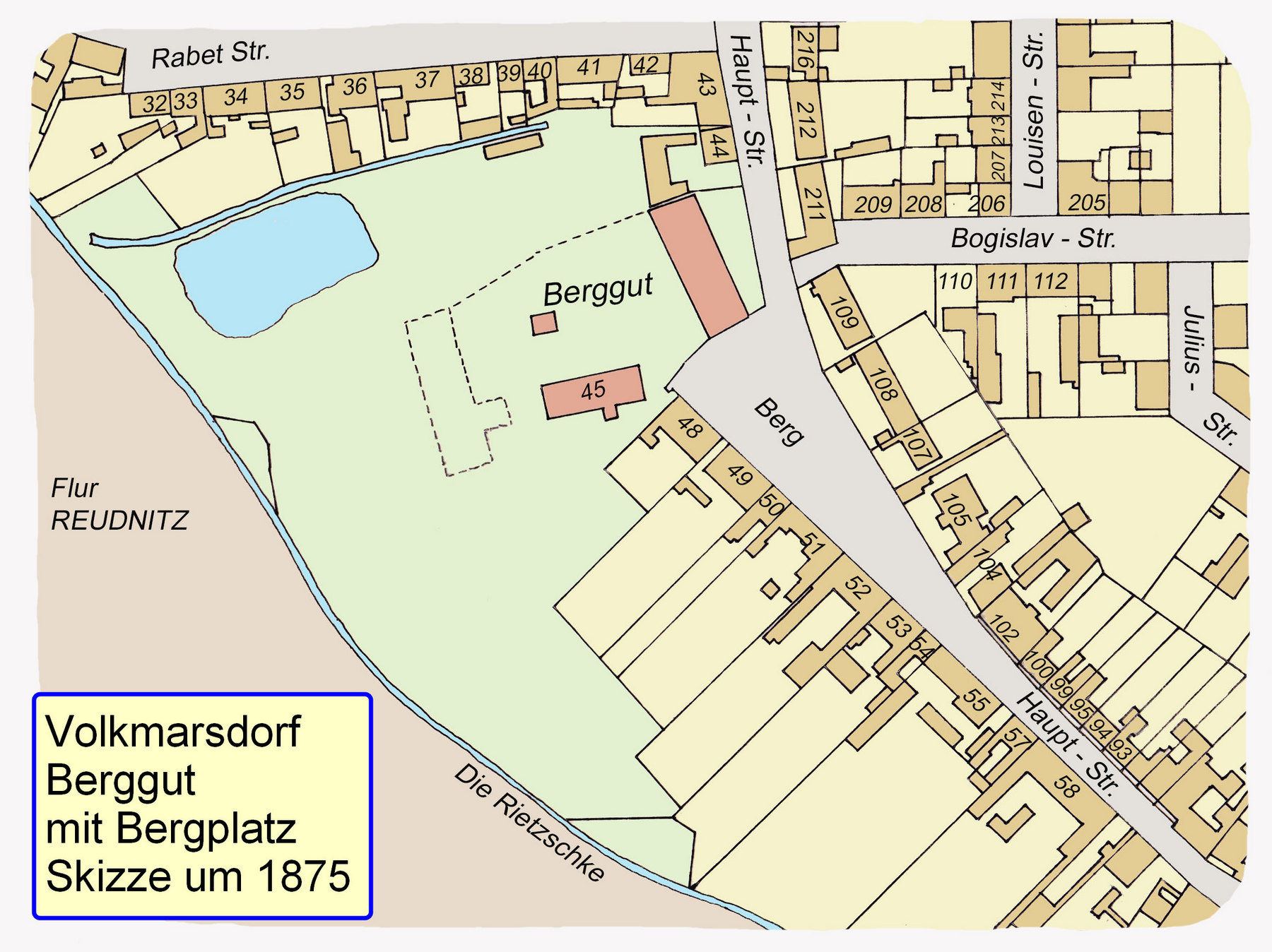 Die eingetragenen Hausnummern entsprechen der Parzellen-Nummerierung (Flurstück-Nr.). Das Berggut trägt demnach die Nr. 45 und das links daneben gestrichelt eingezeichnete Flächen weisen auf die abgebrannten Guts-Gebäudeteile hin. Der Platz vor dem Guteingang ist als Berg bezeichnet.