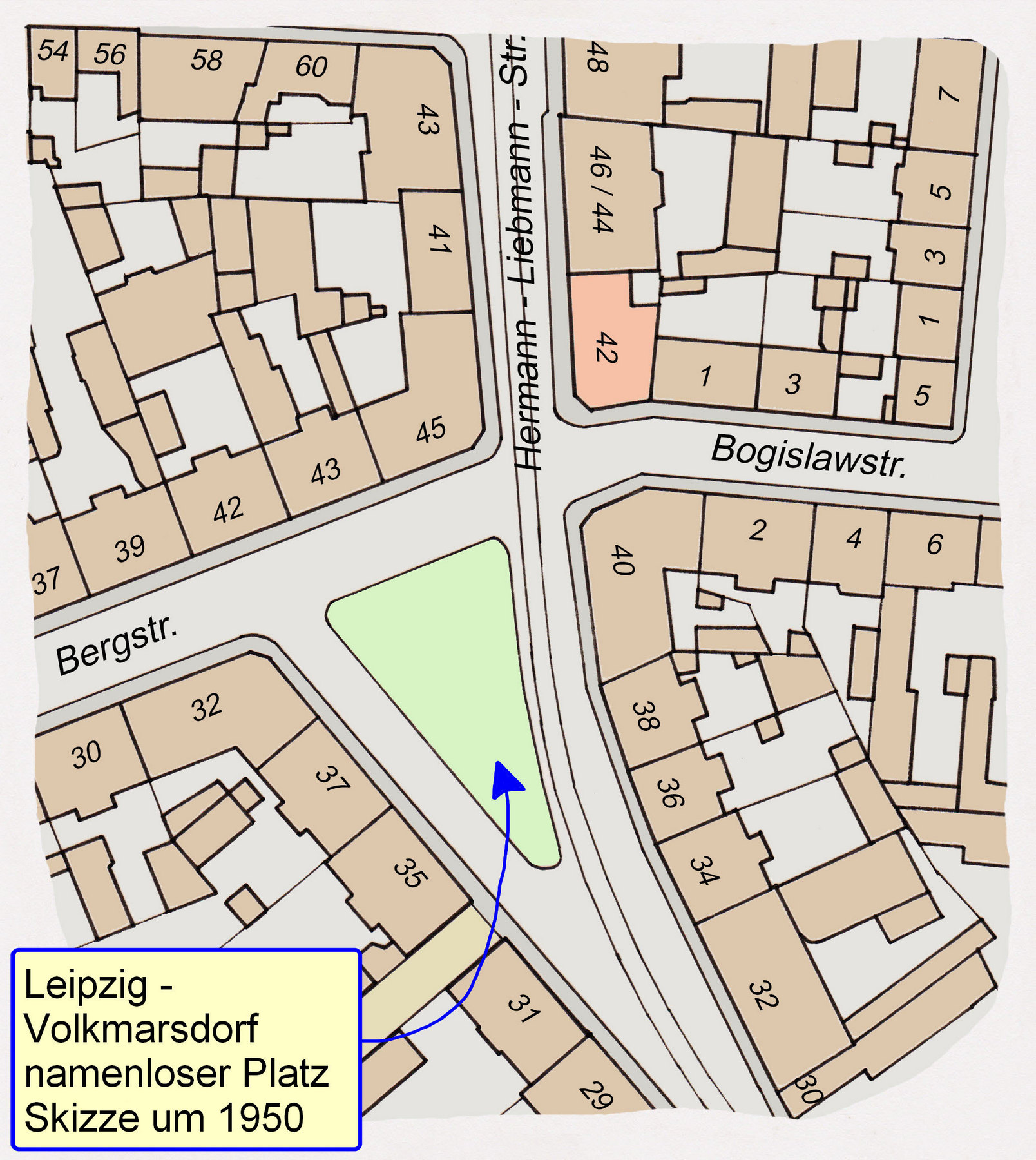 In der Kartenskizze (unten links) habe ich versucht, das Gebiet um den jetzt ,namenlosen‘ Platz in der vollen Bebauung um das Jahr 1950 herum darzustellen.