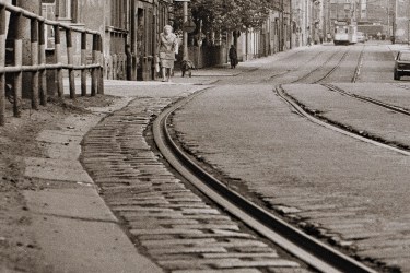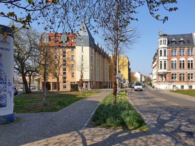 Heute: am (namenlosen) Platz sieht es wieder schmuck aus, auch wenn die meisten alten Häuser inzwischen abgerissen wurden. Die alten Straßenbahn-Schienen der früheren Ringlinie ,,22“ liegen noch.