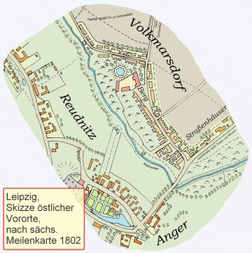 Zur Illustration soll hier eine Skizze nach der Sächsischen Meilenkarte, Blatt Leipzig aus dem Jahr 1802 dienen, Bild links. In Bildmitte ist der historische Ortskern von Volkmarsdorf zu sehen. Volkmarsdorf lag damals am nordöstlichen Ufer des Flüßchens Rietzschke, gegenüber an der südwestlichen Seite lag das Dorf Reudnitz. Der Reudnitzer Ortsteil Tietschendorf (bzw. Tietschen Dörfgen) mit dem kleinen Teich ist unten in der Skizze zu sehen. Von dort aus führt die Landstraße nach Wurzen über die Rietzschke-Brücke und eine Seitenstraße führt durch Volkmarsdorf, vorbei am Gutshof zur Kirche nach Schönefeld. Diese Seitenstraße ist zugleich die Hauptstraße von Volkmarsdorf.