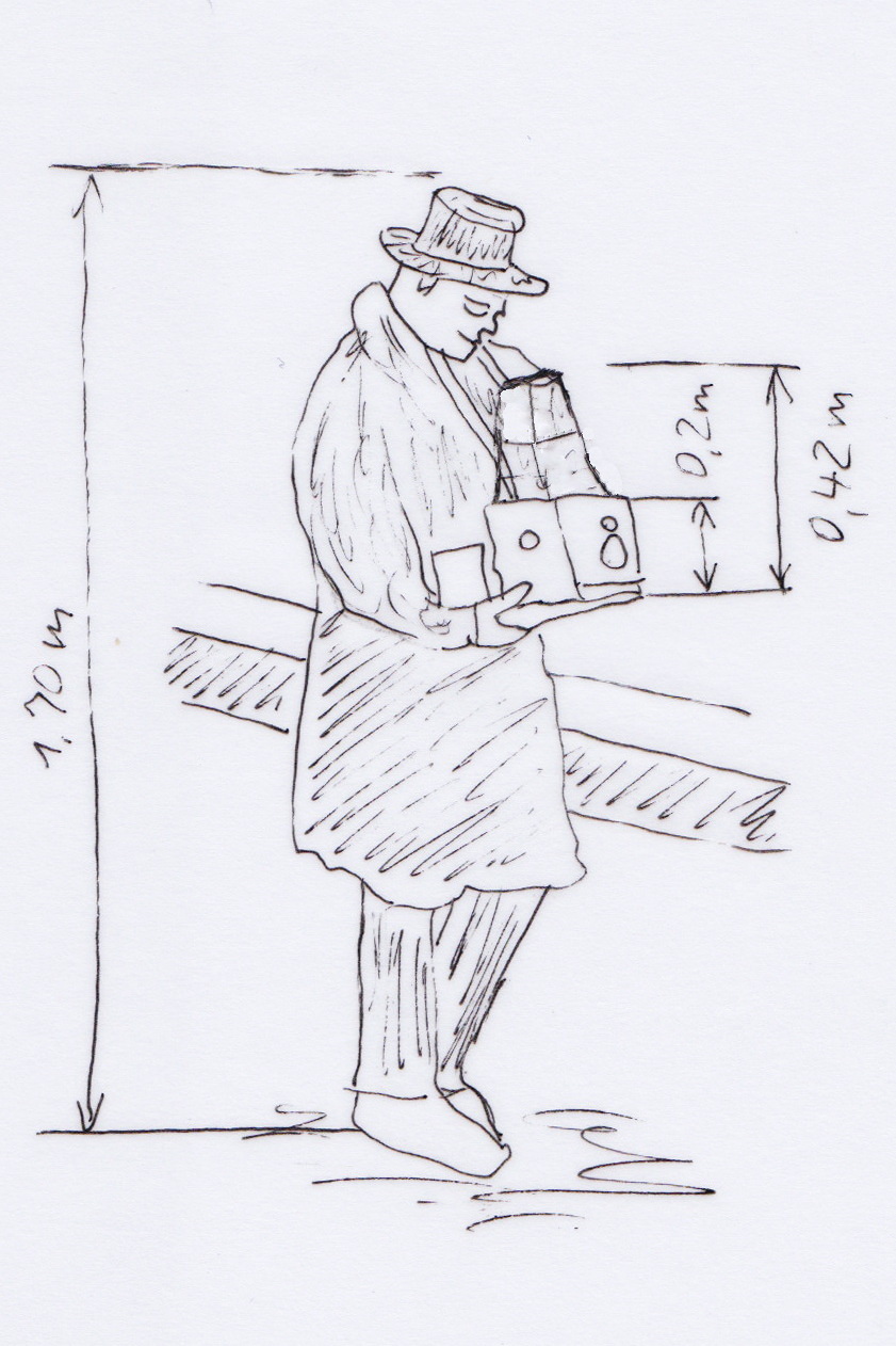 In der mittleren Skizze habe ich versucht ein paar Maße abzunehmen. Demnach war das eigentliche Kameragehäuse würfelförmig mit einem Kantenmaß von etwa 20 cm und hatte einen etwa 20 bis 25 cm hohen Kamera-Aufsatz. Was könnte das für ein Kamera-Typ gewesen sein?