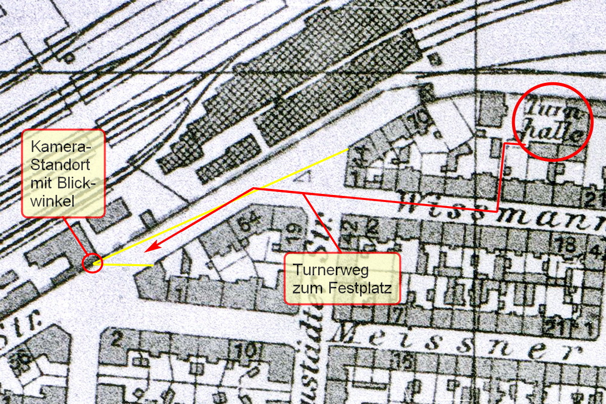 Der Abmarsch auf der alten Ansichtskarte muss so etwa um 10 Uhr statt gefunden haben, um den nach der Festordnung vorgesehenen Aufstellungsplatz für die Turnerinnen und Turner der Stadtgruppen Ost und Nord am Kickerlingsberg um 11 Uhr zu erreichen. Von dort aus ging es über den Augustusplatz schließlich zum Festplatz am heutigen Alten Messegelände.