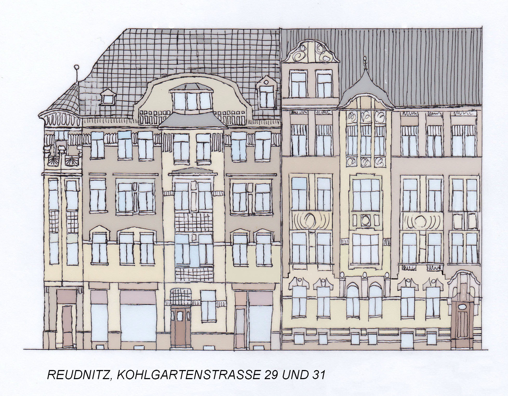 – links die Bauskizzen vom große Eckhaus zur Konstantinstraße, die Kohlgartenstr. 29, daneben anschließend die Nr. 31 und