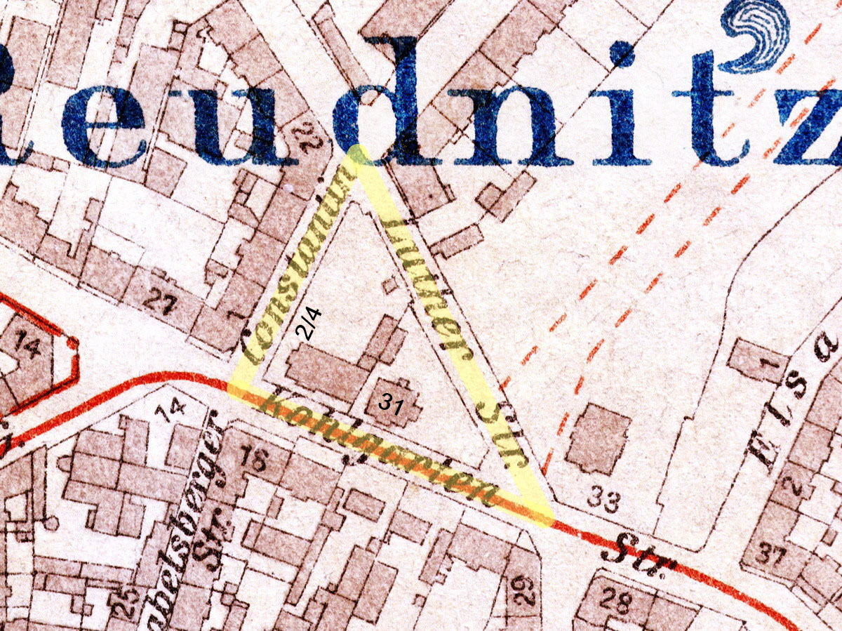 ,,Am 31. Dezember 1897 wurde der Kaufmann Emil Friedrich Worlitzer durch Kauf Eigentümer, und am 18. Januar 1906 kam es an Karl Hermann Kutscher und August Grohmann. Das villenartige Wohnhaus wurde abgetragen und das ganze Flurstück in fünf Baustellen aufgeteilt und bebaut. Das an der Ecke der Kohlgartenstraße und Konstantinstraße gelegene Flurstück 605c, als Stelle des ehemaligen Gutsgebäudes, bekamen durch Kauf Richard Eduard Klein und Eduard Rothe am 4. Mai 1906.“ [Quelle #3]