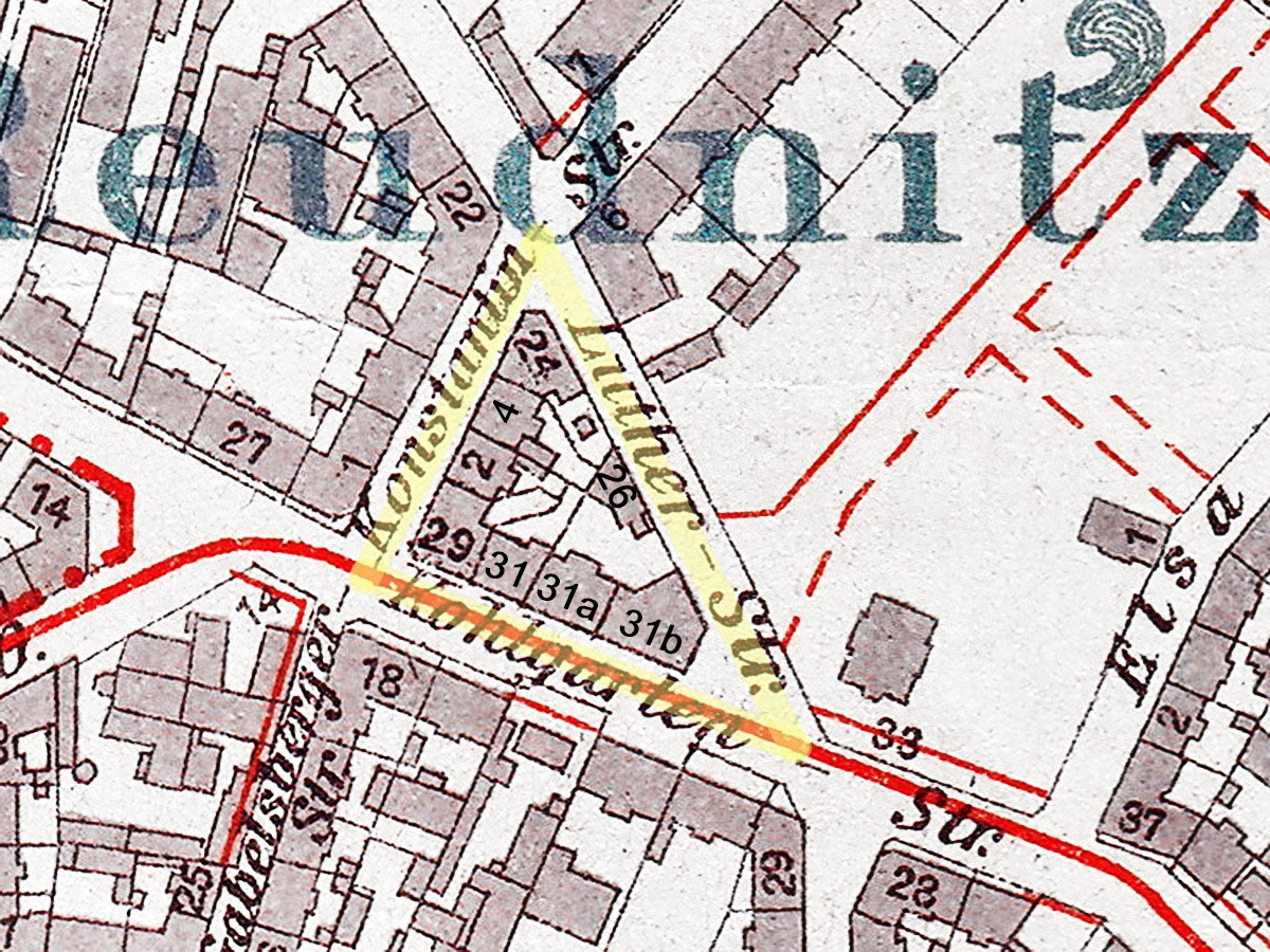 Es gibt ja heute nur noch zwei Häuserecken in diesem Straßendreieck; denn die Ecke zwischen Konstantin- und Kohlgartenstraße ist ja (momentan) nicht bebaut. Und zum zweiten – was heißt hier Luther-Dreieck? Hat die Bebauung etwas mit dem Reformator Martin Luther zu tun?