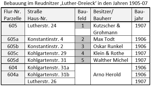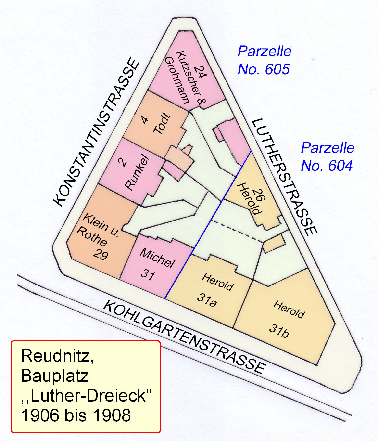 Ich vermute, dass zuerst die beiden Häuser an der Konstantinstraße entstanden sind und gemäß der mir zugänglichen Bauakten danach die Bebauung der Häuser Kohlgartenstraße 31a und b noch im Jahr 1906 erfolgte. In den Jahren 1906/07 entstanden die benachbarten Gebäude Kohlgartenstraße 29 und 31. Als letztes wurden die Gebäude in der Lutherstr Nr. 24 und etwas später die Nr. 26 gebaut.
