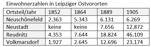 Im Zeitraum von 1864, als diese Geschichte begann, bis zum Jahr 1905, an dem ich sie jetzt fortsetzen möchte, sind die früheren Vororte im Leipziger Osten nahezu vollständig bebaut worden. Die Einwohnerzahlen haben sich um ein Vielfaches vergrößert wie man nachfolgender Tabelle insbesondere für die Ostvororte Volkmarsdorf und Reudnitz entnehmen kann. Im genannten Zeitraum sind sogar neue Gemeinden wie Neustadt entstanden, die inzwischen selbst Einwohnerzahlen mittlerer Kleinstädte erreicht haben.