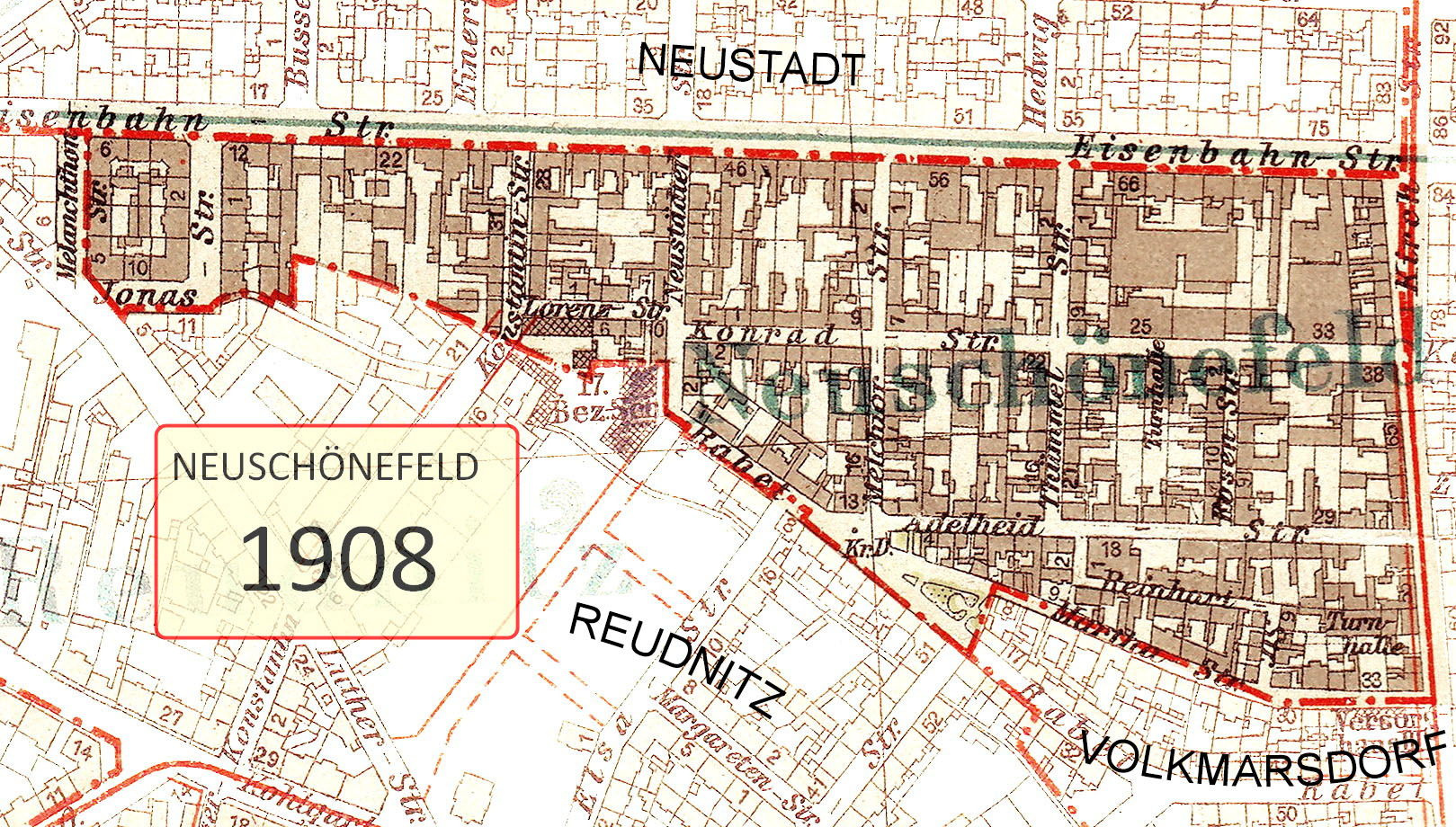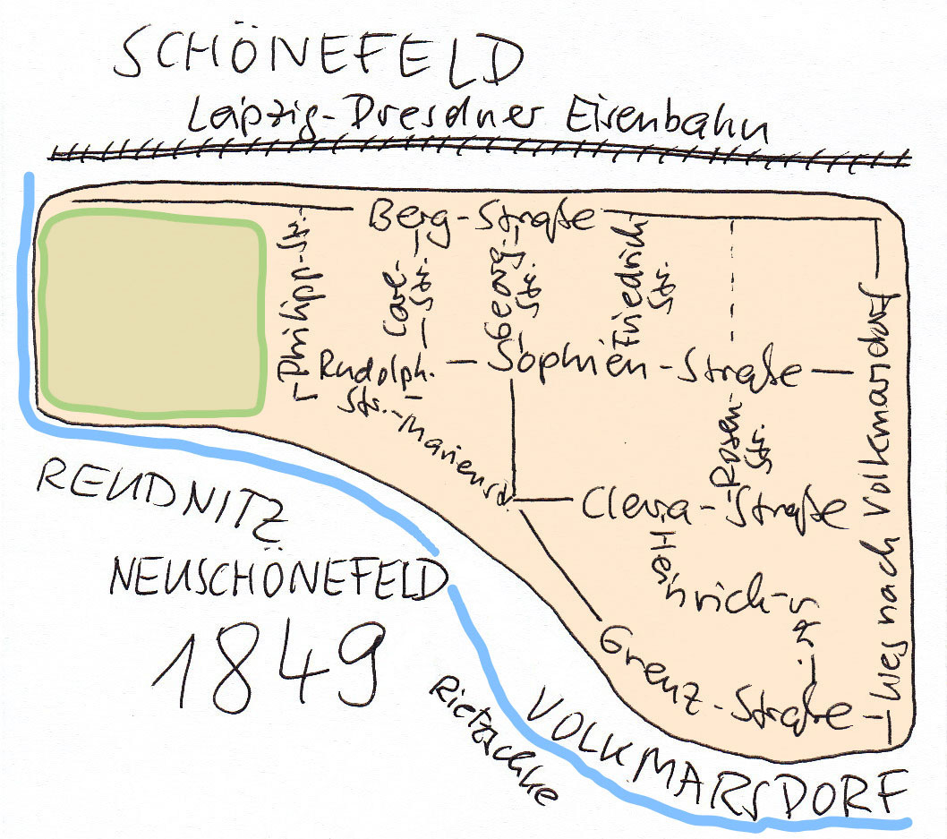Heute gibt es im alten Neuschönefeld, südlich der Eisenbahnstraße zwischen der Melanchthon- und der Hermann-Liebmann-Straße, noch neun Straßen, die zum früheren Gemeindegebiet von Neuschönefeld gerechnet werden könnten. Zwei habe ich bereits genannt, da kommen mit der Eisenbahn-, Jonas-, Konstantin-, Konrad-,Lorenz-, Neustädter Straße und der Straße mit dem Namen Rabet noch sieben dazu und wenn man’s genau nimmt noch ein Otto-Runki-Platz und der Rabet-Park als jüngste Flächenbezeichnung.