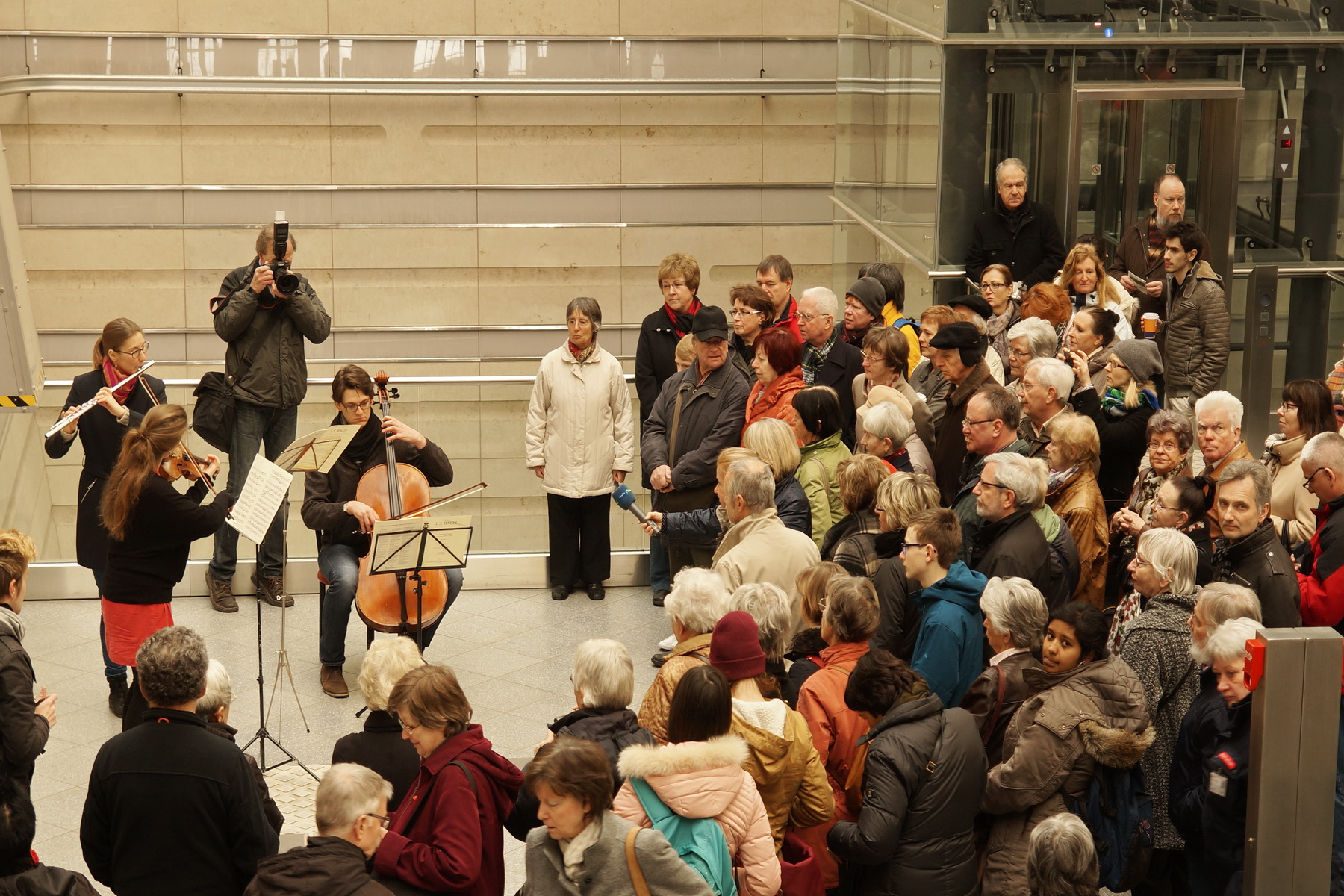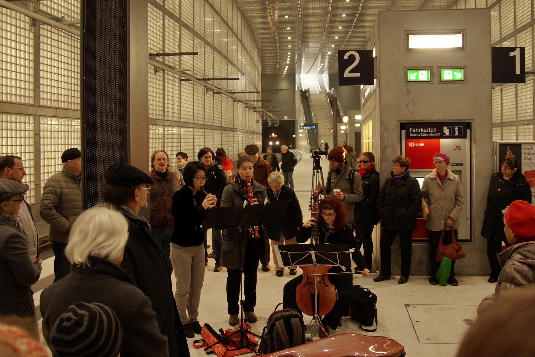 Unser Eindruck: wie den Bildern zu entnehmen ist, waren die Musiker gut zu sehen, die Akustik war so auf halber Höhe zum Hauptbahnhof nicht ganz perfekt, aber wie hier im Bild bei der Triosonate G-Dur (BWV 1039) herrschte kein Mangel an begeisterten Zuhörern.
