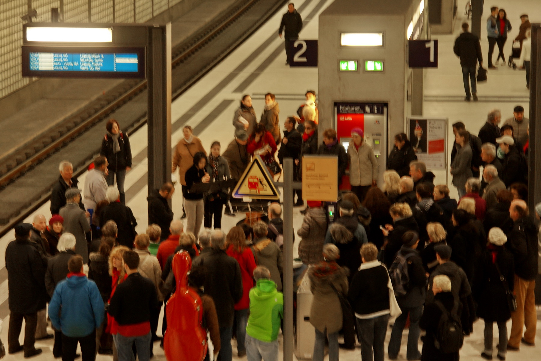 11 Uhr dem Vokalensemble Amarcord zuhören. Aber das war nicht ganz so einfach, weil die Gesangsdarbietungen im Bereich des Aufgangs zur früheren Untergrundmessehalle am Markt stattfanden. Dort ging es tüchtig eng zu und vom Bahnsteig aus war nicht an die Aufführung heranzukommen, weil der betreffende südliche Treppenbereich von Zuhörern und Enthusiasten total blockiert war, Bild links.